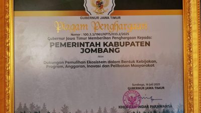 Jombang (cokronews.com) — Pemerintah Kabupaten (Pemkab) Jombang kembali menorehkan prestasi dalam upaya pelestarian lingkungan. Bupati Jombang menerima penghargaan kategori Pemulihan Ekosistem yang diserahkan langsung oleh Gubernur Jawa Timur, Khofifah Indar Parawansa. Acara penghargaan ini merupakan bagian dari kegiatan “Sinergi Rimbawan Dalam Rangka Pemulihan Ekosistem Dan Peningkatan Sosial Ekonomi Masyarakat Kehutanan Jawa Timur” yang diselenggarakan pada Selasa, 22 Juli 2025, di Bukit Kayoe Putih, Desa Kupang, Kecamatan Jetis, Kabupaten Mojokerto.