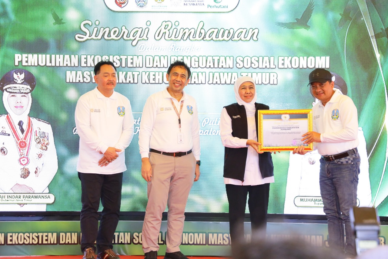 Jombang (cokronews.com) — Pemerintah Kabupaten (Pemkab) Jombang kembali menorehkan prestasi dalam upaya pelestarian lingkungan. Bupati Jombang menerima penghargaan kategori Pemulihan Ekosistem yang diserahkan langsung oleh Gubernur Jawa Timur, Khofifah Indar Parawansa. Acara penghargaan ini merupakan bagian dari kegiatan “Sinergi Rimbawan Dalam Rangka Pemulihan Ekosistem Dan Peningkatan Sosial Ekonomi Masyarakat Kehutanan Jawa Timur” yang diselenggarakan pada Selasa, 22 Juli 2025, di Bukit Kayoe Putih, Desa Kupang, Kecamatan Jetis, Kabupaten Mojokerto.