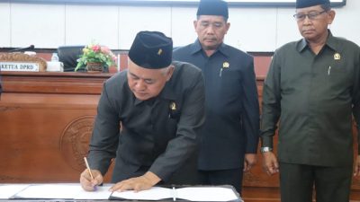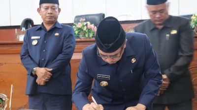 Sebelum memberikan sambutan, Bupati Madiun melakukan penandatanganan persetujuan bersama Raperda RPJMD oleh unsur DPRD Kabupaten Madiun.