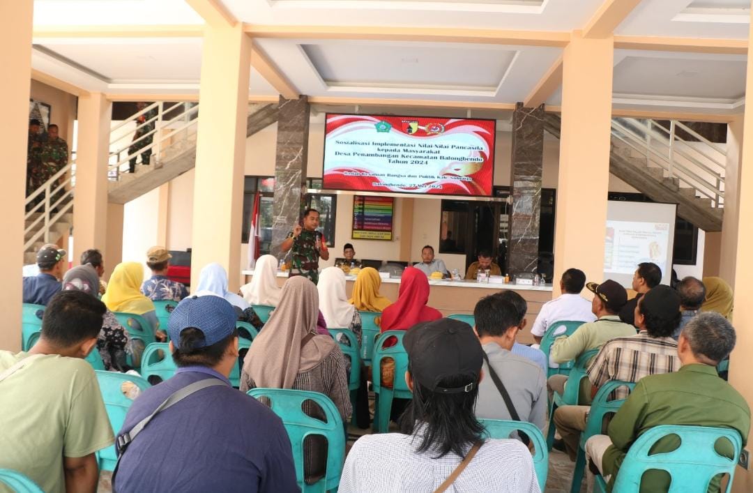 Sidoarjo (cokronews.com) —– Dalam semangat memperkokoh fondasi kebangsaan melalui nilai-nilai luhur Pancasila, Letkol Inf Guntung Dwi Prasetyo Dandim 0816/Sidoarjo Letkol Inf Guntung Dwi Prasetyo sekaligus Dansatgas TNI Manunggal Membangun Desa (TMMD) ke-120 tahun 2024 Kodim 0816/Sidoarjo, menggelar sebuah inisiatif yang sangat berarti. Hari ini, di Desa Penambangan Kecamatan Balongbendo upaya nyata penguatan nilai-nilai Pancasila dipersembahkan secara langsung kepada masyarakat. Acara sosialisasi yang berlangsung hangat dan penuh kebersamaan tersebut melibatkan beragam elemen masyarakat Desa Penambangan. Senin, 27 Mei 2024.