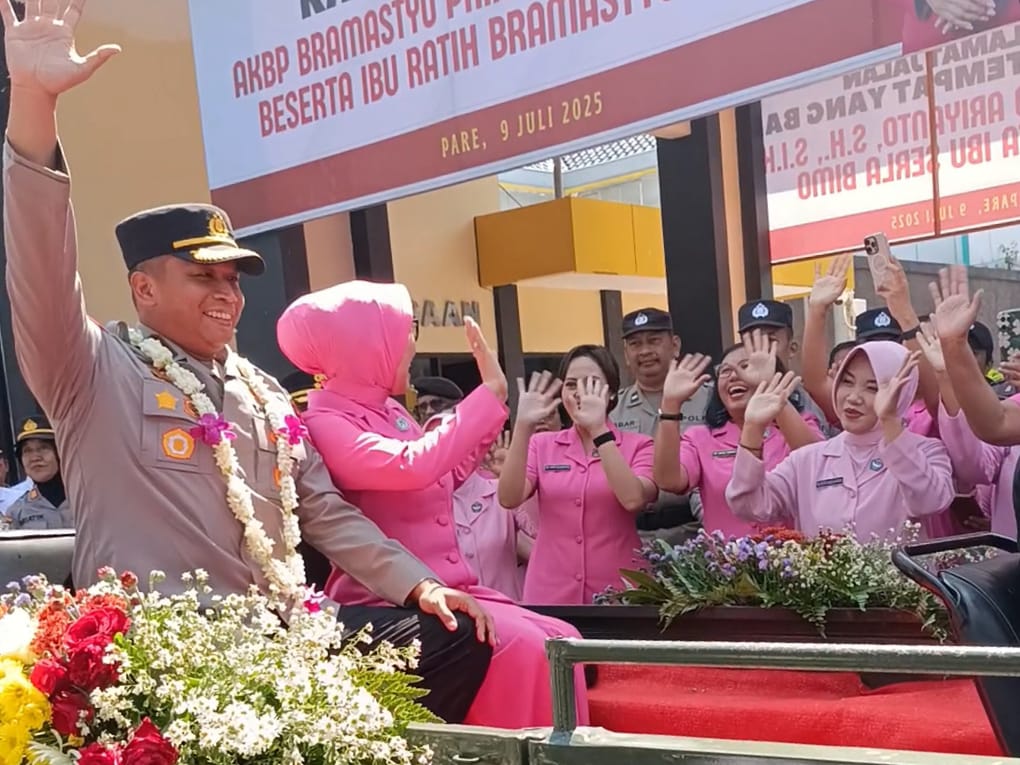 Upacara pelepasan AKBP Bimo Ariyanto S.H., S.I.K didampingi oleh Ny. Serla Bimo berjalan keluar menuju Gerbang Wicaksana Laghawa diiringi tebaran bunga oleh anggota-anggota Polri Kediri menjadi tanda pamit sekaligus menyambut Kepala Polres Kediri yang baru AKBP Bramastyo Priaji S.H,S.IK, M.Si. (Tania)