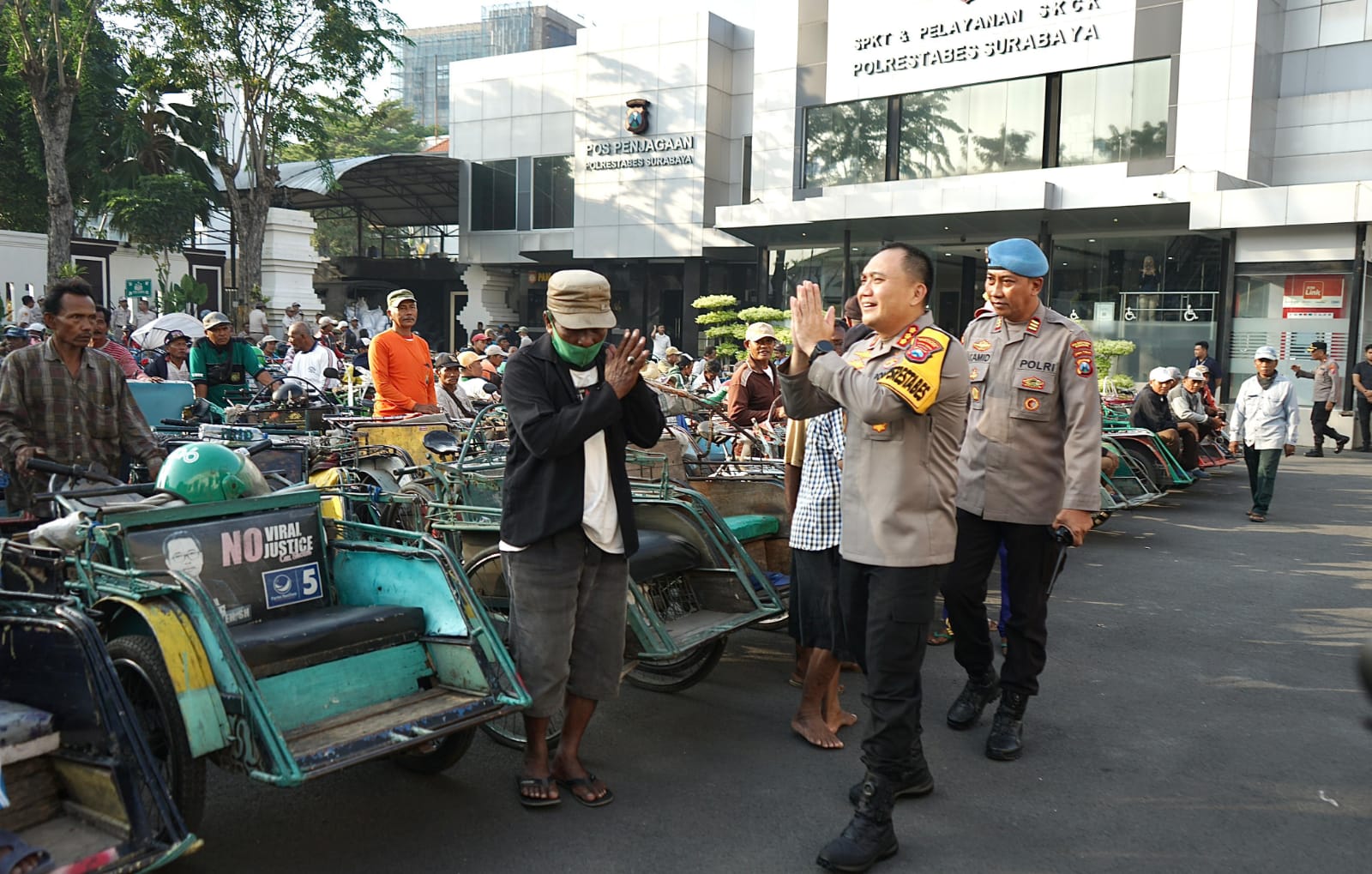 Ratusan abang becak pun serentak datang ke Mapolrestabes Surabaya memenuhi undangan sarapan bareng Kapolrestabes Surabaya yang hadir didampingi dengan Pejabat Utama (PJU) untuk langsung menyapa para abang becak.