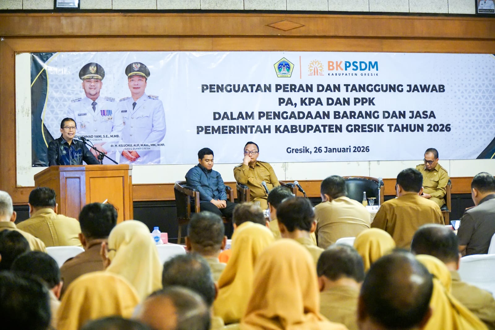 Pernyataan tersebut disampaikan dalam kegiatan Penguatan Peran dan Tanggung Jawab Pengguna Anggaran (PA), Kuasa Pengguna Anggaran (KPA), dan Pejabat Pembuat Komitmen (PPK) dalam Pengadaan Barang dan Jasa Pemerintah Kabupaten Gresik Tahun 2026 yang digelar di Mandala Bakti Praja, Senin (26/1).